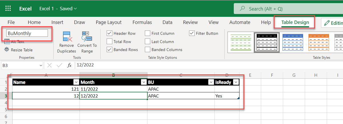 Läpikäytävissä Exceleissä tulee kaikissa olla samanniminen taulukko (BuMonthly).