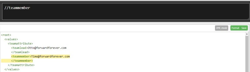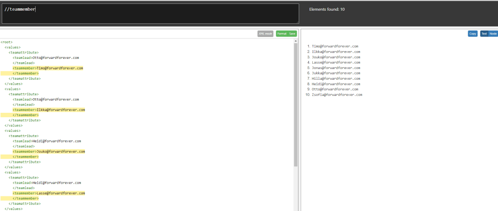 Nyt voimme kokeilla erilaisia XPath-komentoja. Esimerkiksi //teammember palauttaa kaikki tiimien jäsenet.