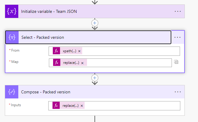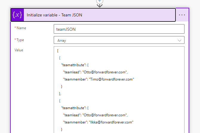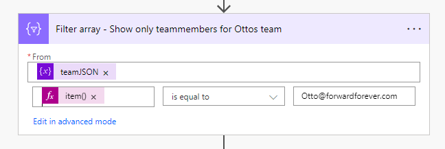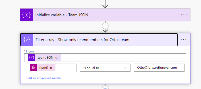xpath(xml(json(concat('{ "root": {"values": ', variables('teamJSON'), ' }}'))),'//teamattribute[teamlead="Otto@forwardforever.com"]/teammember')