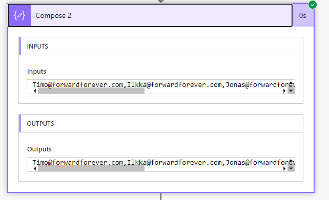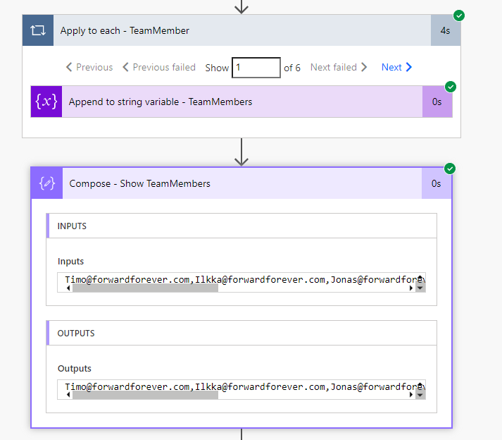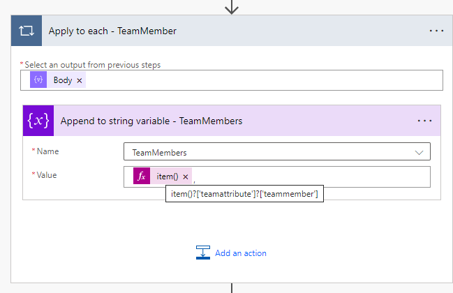 Käydään Apply to each -toiminnon avulla tulosjoukko läpi ja lisätään kukin tiiminjäsen (plus pilkku) muuttujaan.