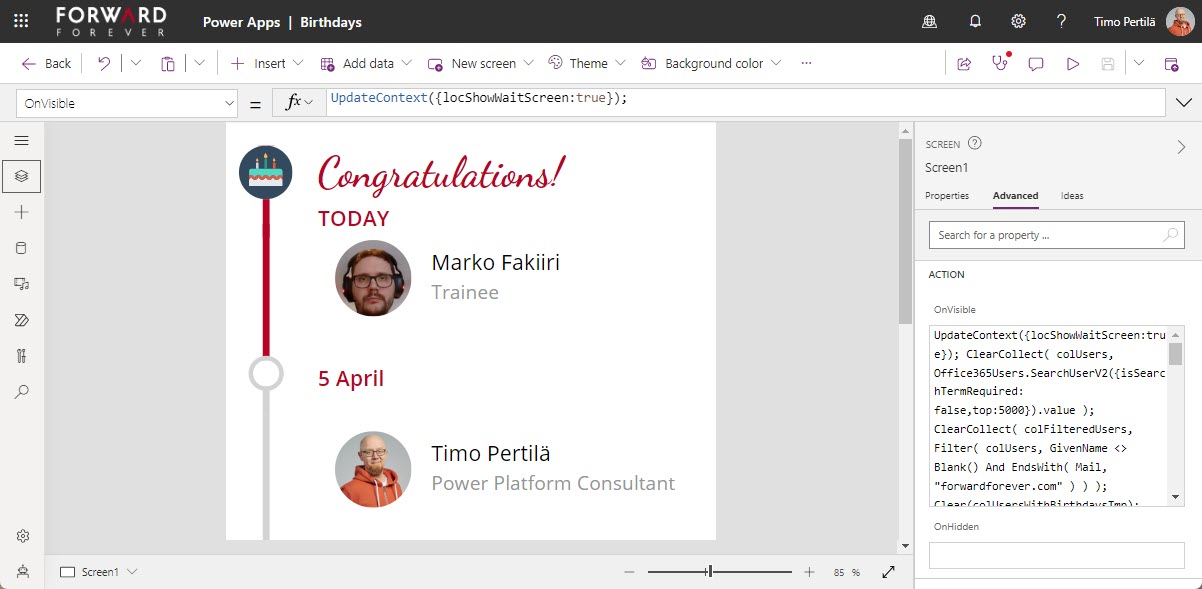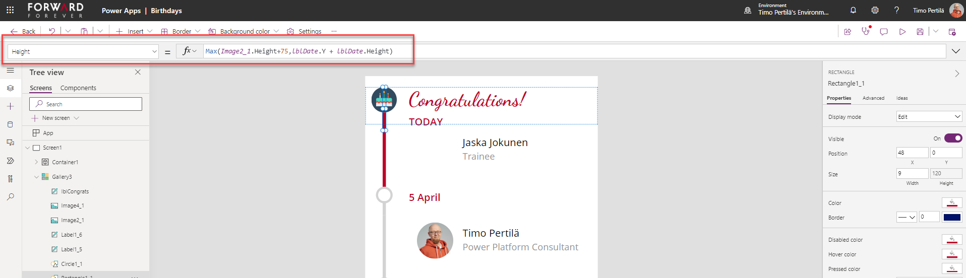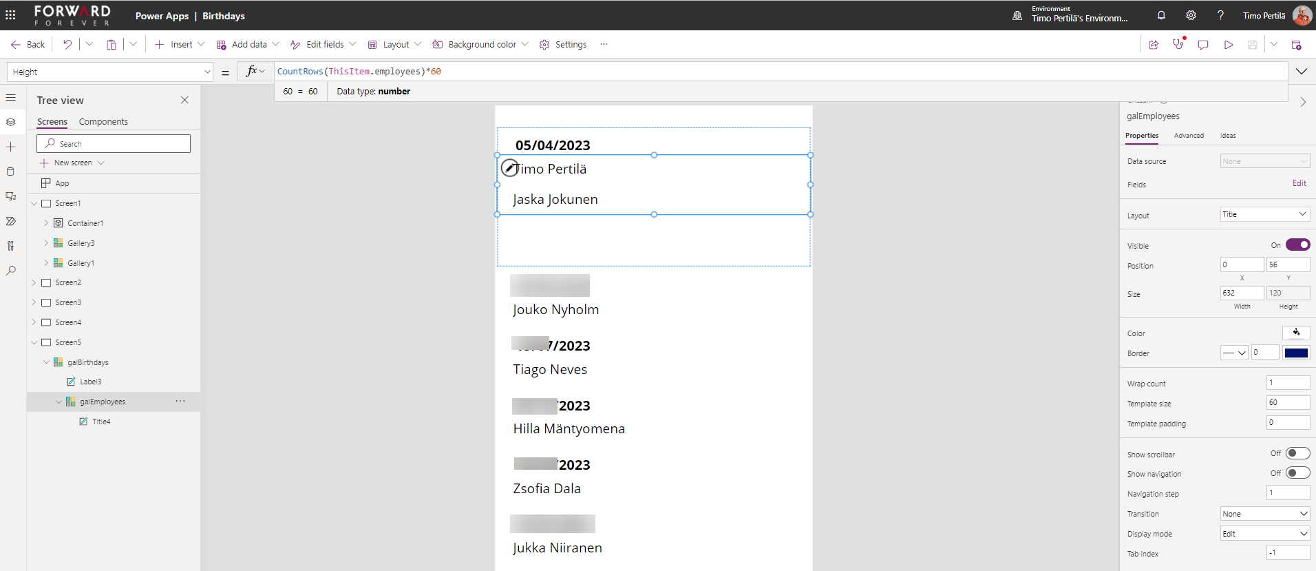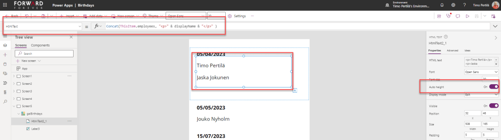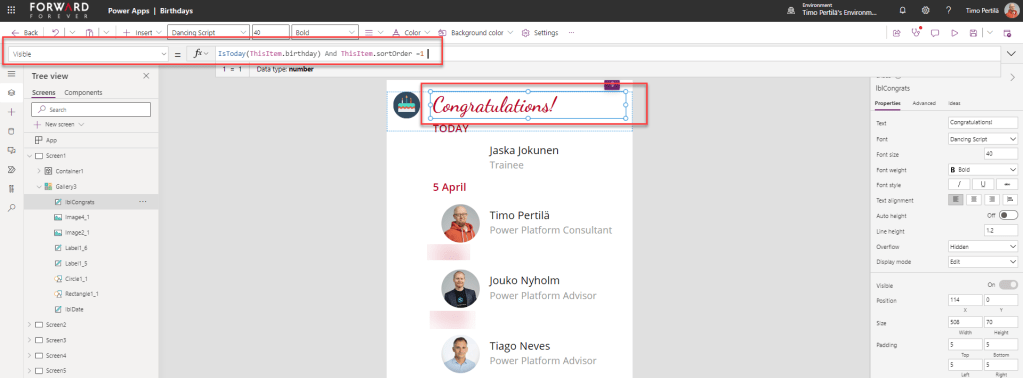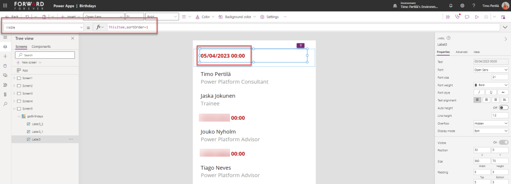 - Päivämäärä: Text(ThisItem.birthday,”d mmmm”)