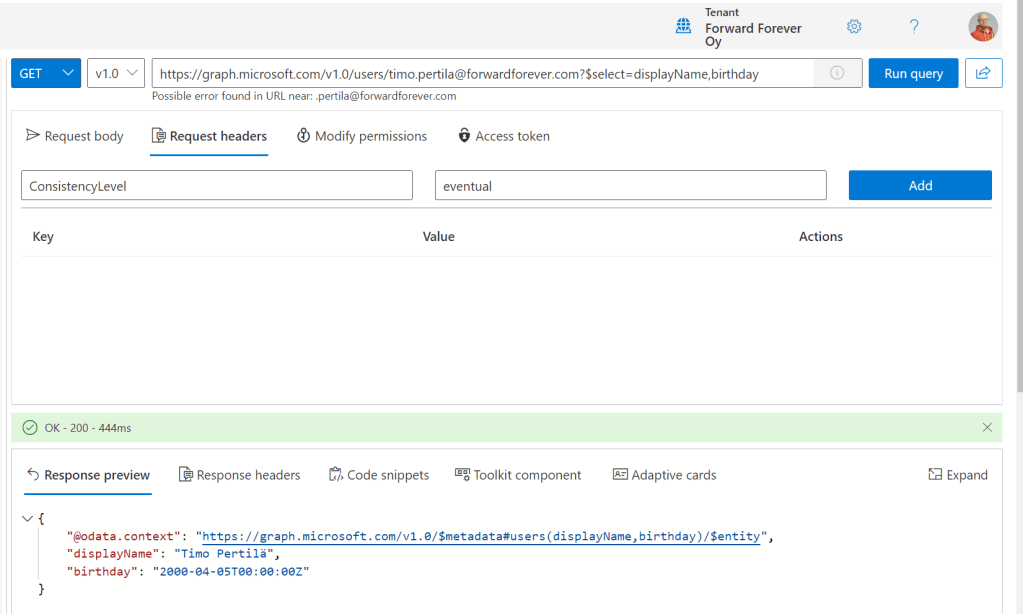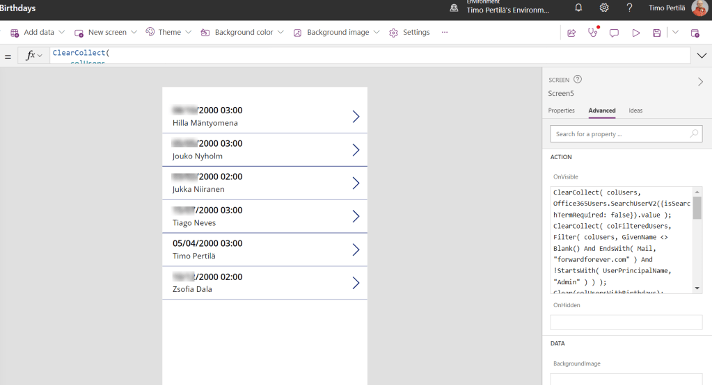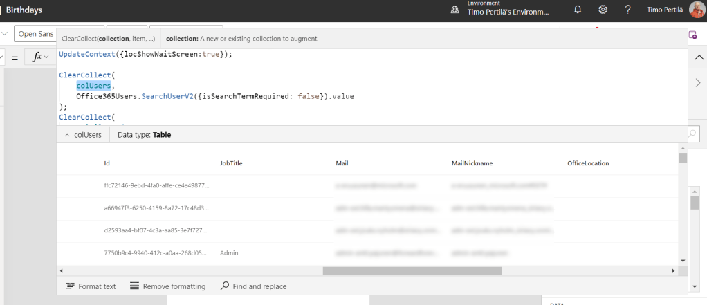 Sovellus tarvitsee lähtötiedoksi käyttäjien syntymäpäivät. Siltä osin kuin ne löytyvät. Helppo homma! Haetaan vain kaikkien käyttäjien tiedot Office365 Users -yhdistimellä.