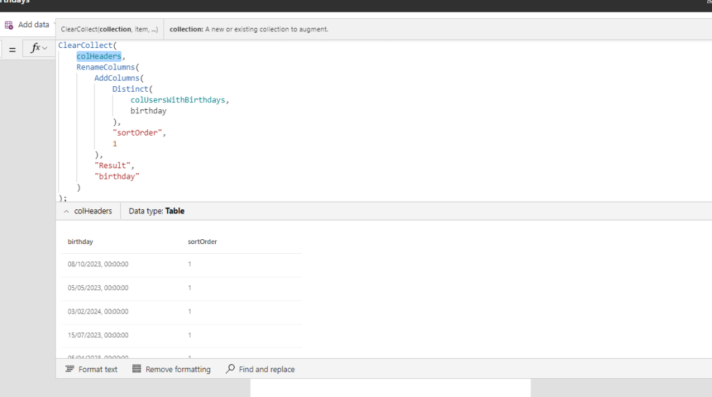 Collect(colUsersWithBirthdays,colHeaders);