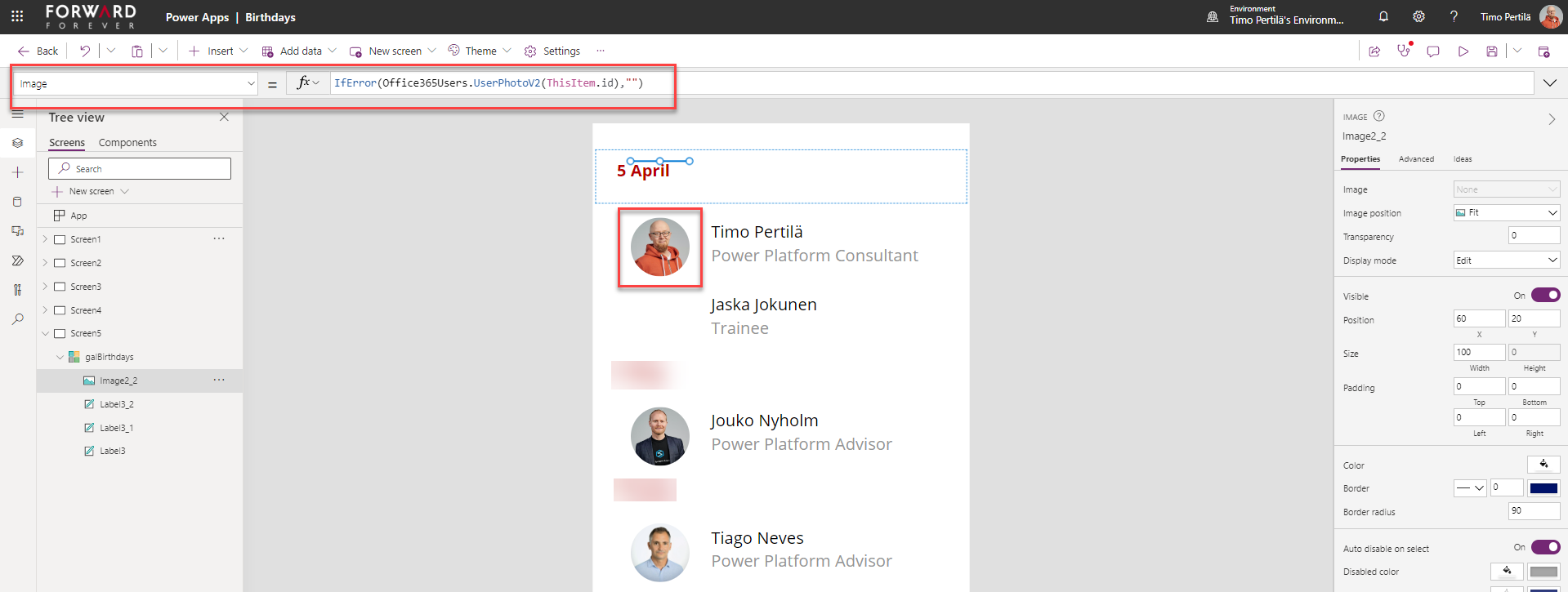 - Kuva: IfError(Office365Users.UserPhotoV2(ThisItem.id),””)