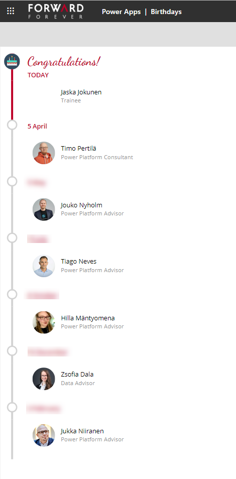 Näin yksi päivä Twitterissä João Mendes:in tekemän SPFx-sovelluksen, joka visualisoi hienosti työntekijöiden tulevia syntymäpäiviä.