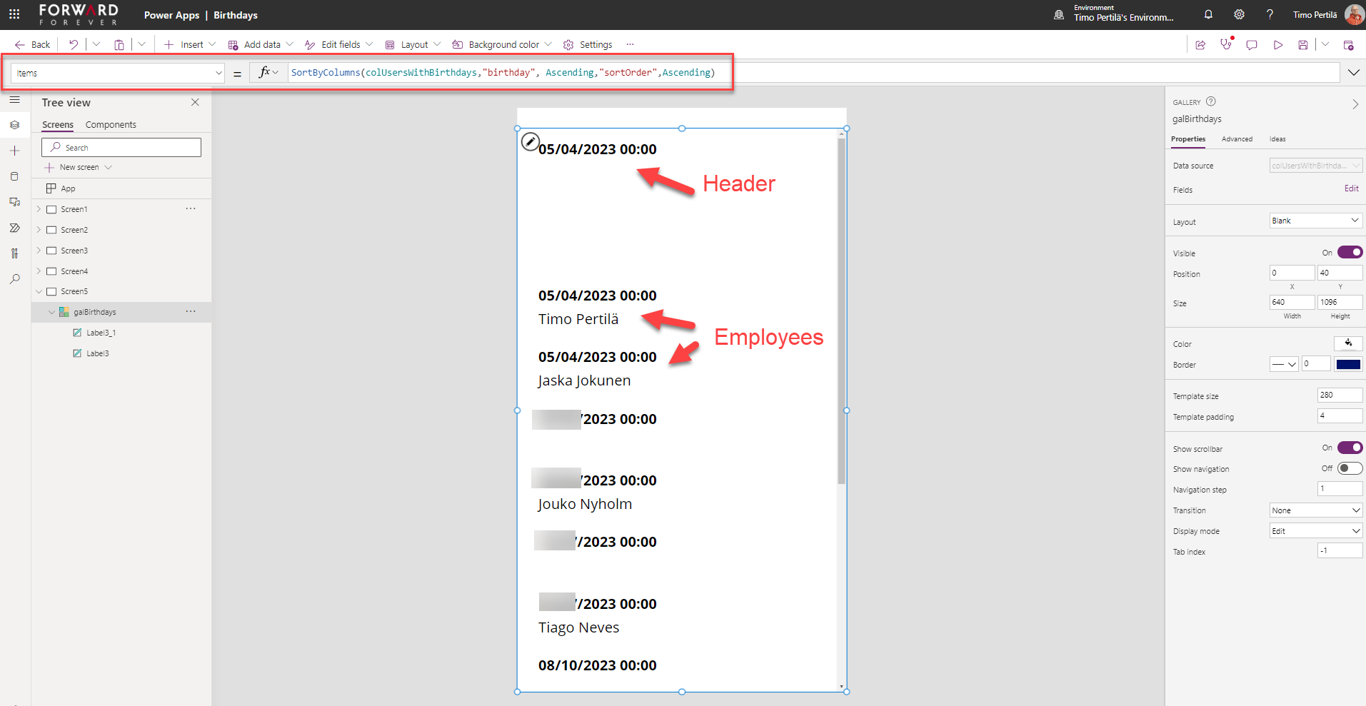 Näin listassa on aina ensin otsikkorivi syntymäpäivälle (Header) ja sen jälkeen varsinaiset sankarit (Employees).