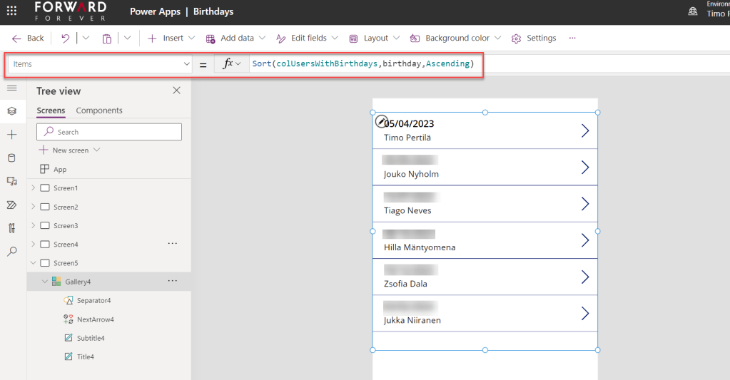 Lisätään näytölle galleria, joka esittää kokoelman (colUsersWithBirthdays) sisällön.