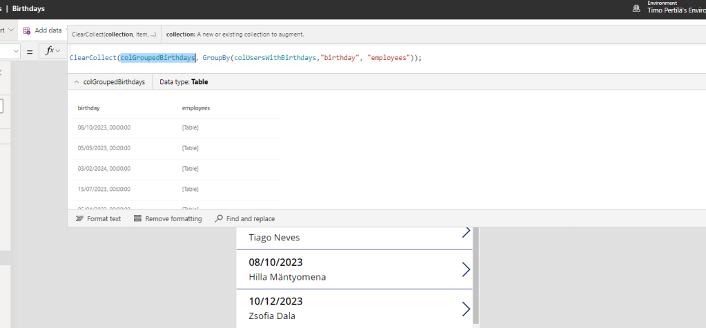 ClearCollect(colGroupedBirthdays, GroupBy(colUsersWithBirthdays,"birthday", "employees"));