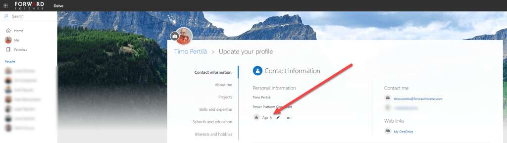Office -ympäristössä henkilöt voivat lisätä, tai olla lisäämättä, syntymäpäivänsä Delve-profiiliinsa.