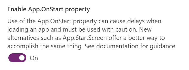 Microsoft on usean vuoden pyrkinyt ohjaamaan tekijöitä pois App OnStart:in käytöstä. Power Appsissa on jopa asetus, jolla koko pahuuden saa pois käytöstä (enable App.OnStart propery).