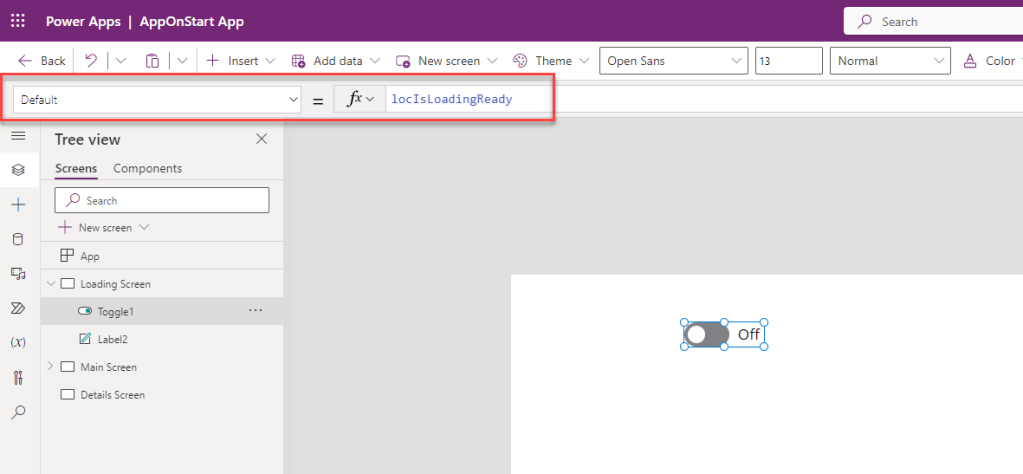 Lopuksi näytölle lisätään vipu (toggle), jonka oletusarvona (default) käytetään muuttujaa (locIsLoadingReady). Sen arvo vaihtuu true:ksi kun kaikkki on valmista.