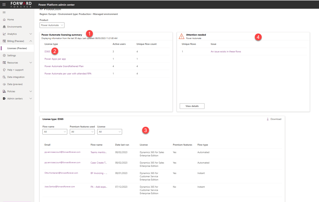 - Lisenssityypin (2) valitsemalla näkee listan (3) sitä käyttävistä käyttäjistä ja flow’sta