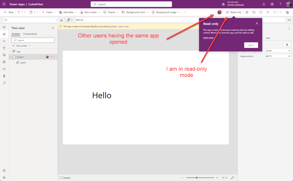 Alla olevassa kuvassa on sovellus muokattavana (editing). Näemme että sovellus on auki myös toisella käyttäjällä.