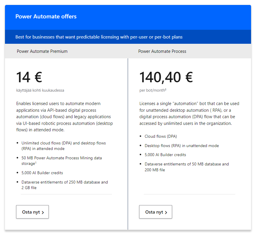 - yhden flow’n koko organisaation käyttöön (sama kuin vanha Power Automate per flow -lisenssi)