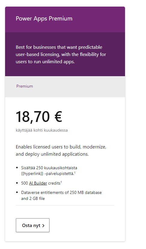 Samalla Power Apps per App plan on hävinnyt lisenssisivulta. Se on kuitenkin edelleen saatavilla.