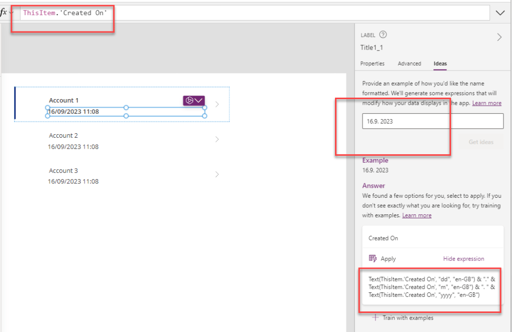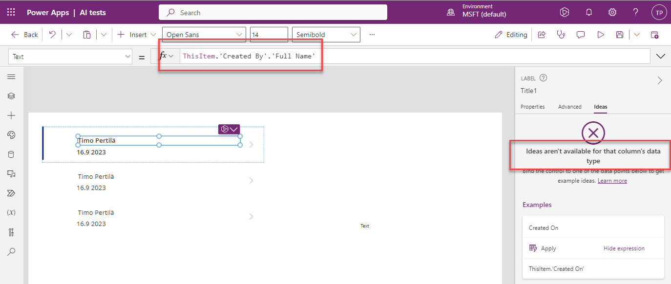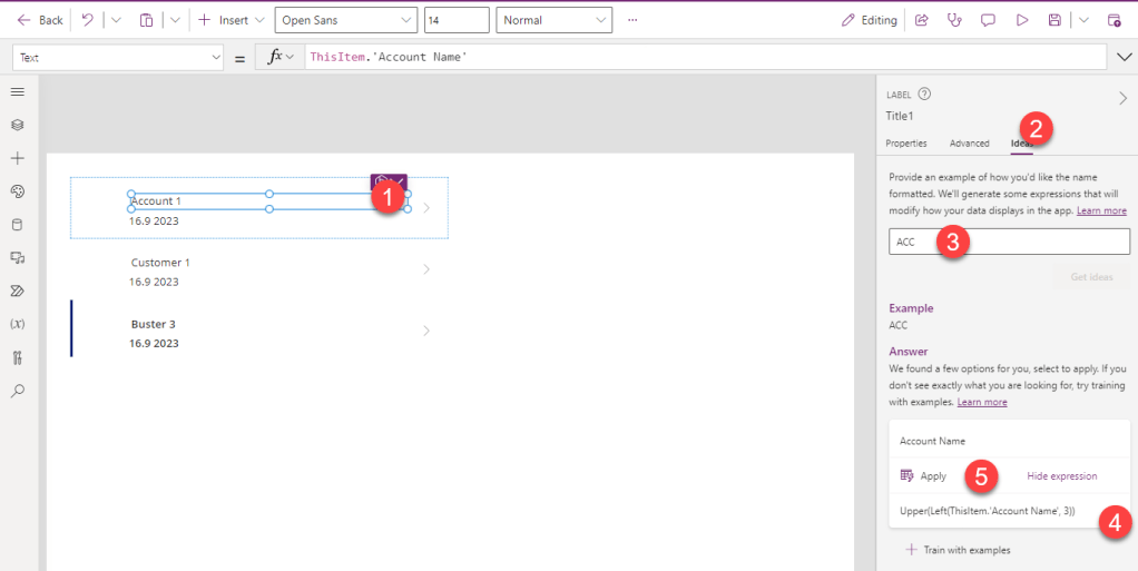 Tämä lienee Power Platformin ensimmäinen AI-pohjainen avustaja. Voit valita galleriassa olevan tekstikentän (1) ja ideat-välilehdellä (2) antaa esimerkin miten kentän arvo halutaan muotoilla (3).