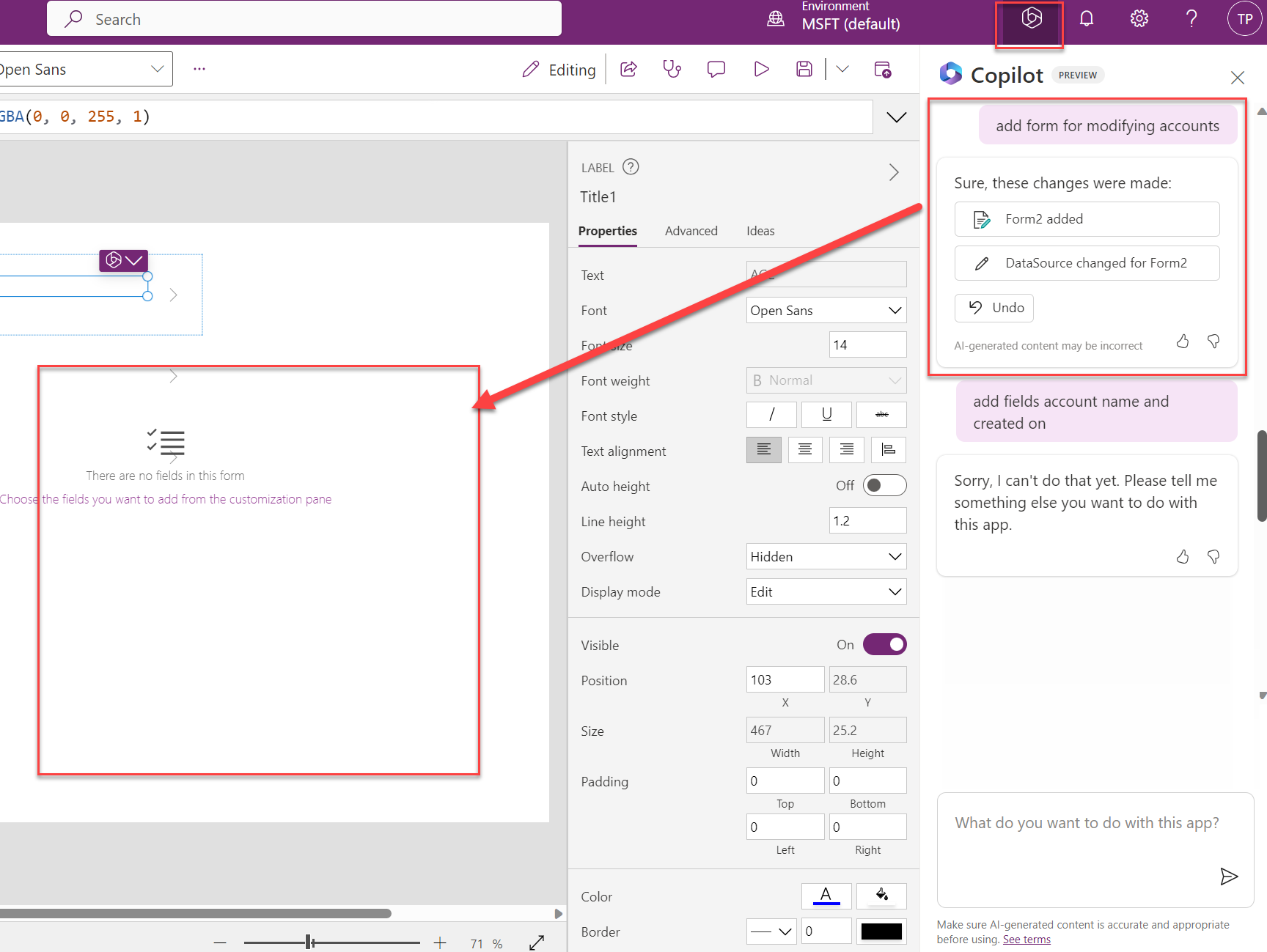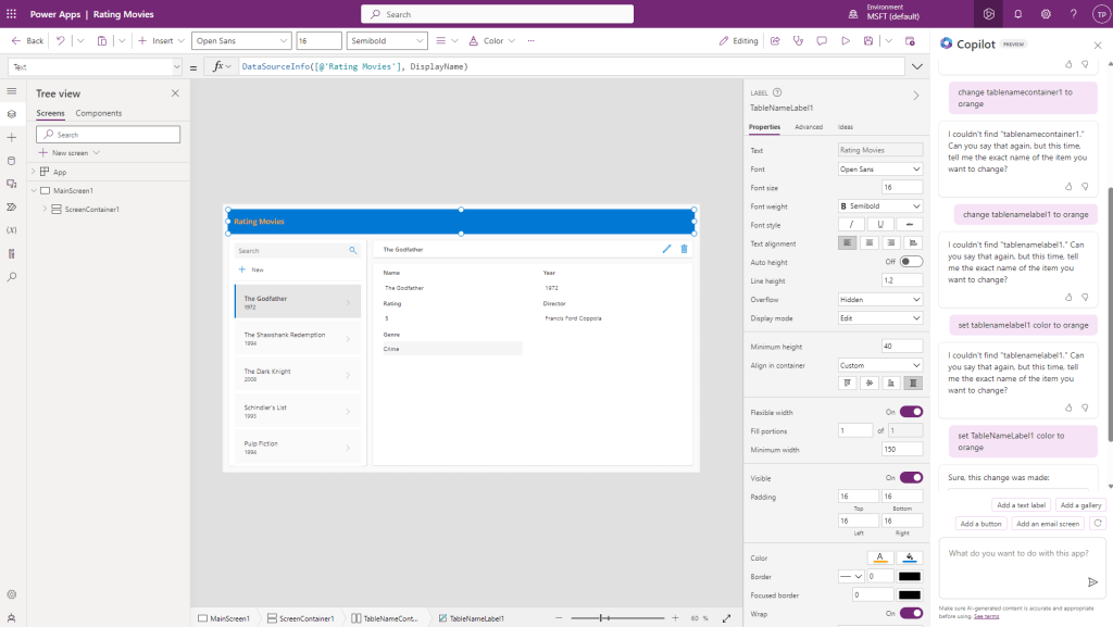 Power Appsista löytyy oma Copilot, jota voi pyytää tekemään pieniä muutoksia sovellukseen.