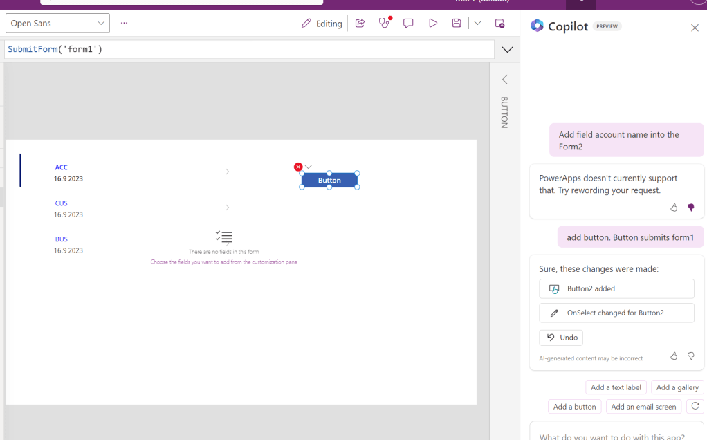 Mutten usko hetkeäkään että esimerkiksi Power Appsin copilot jäisi tähän. Vuoden päästä se on takuulla huomattavasti kyvykkäämpi. Ja ehkä jo minullakin päivittäisessä käytössä.
