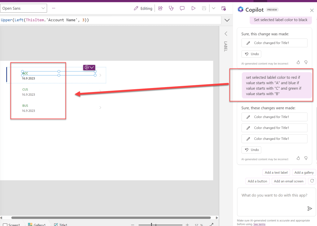 Yksittäisen kontrollin ominaisuuksia voi vaihtaa copilotin avulla. Tyyliin ”Set selected label color to black”.