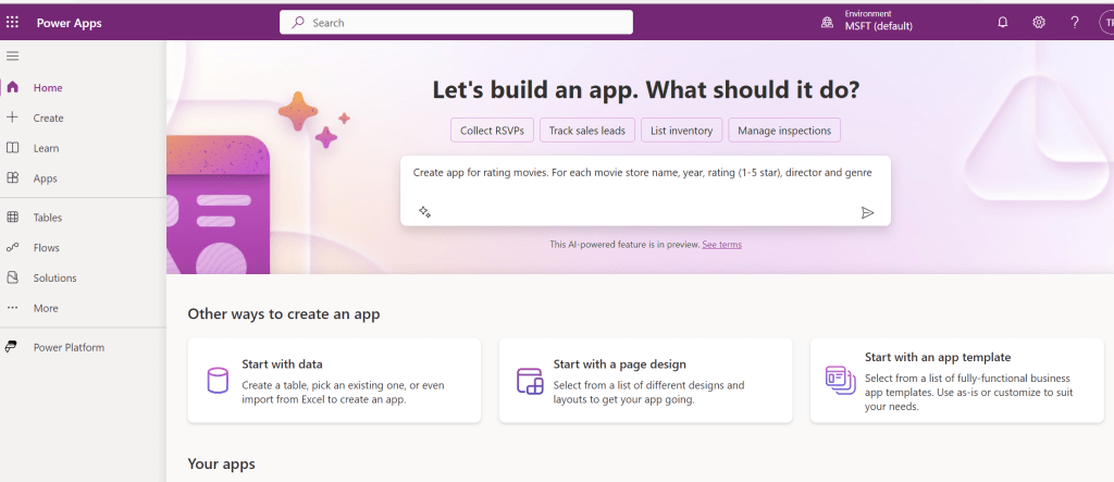 Power Appseja voi myös luoda täysin tyhjästä luonnollista kieltä käyttäen. Kokeillaanpas sitä.
