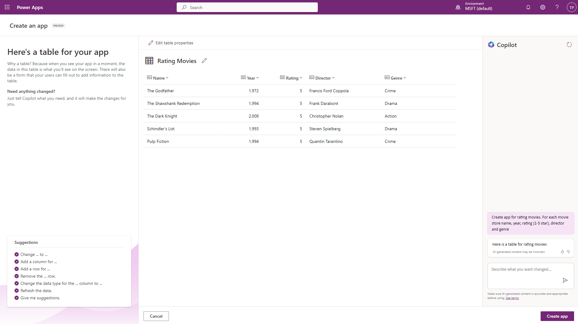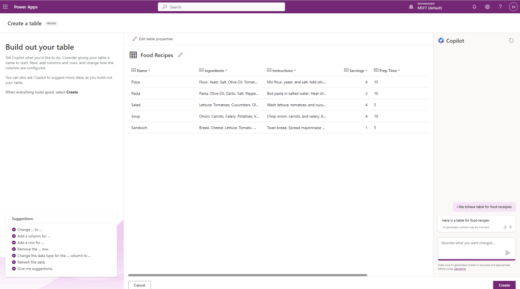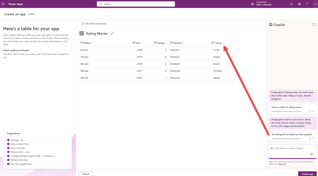 Avustaja hahmotelee ensin (Dataverse) taulun, johon arvostelut kerätään. Se osaa luoda jopa esimerkkisisältöä siihen. Vaikuttavaa.