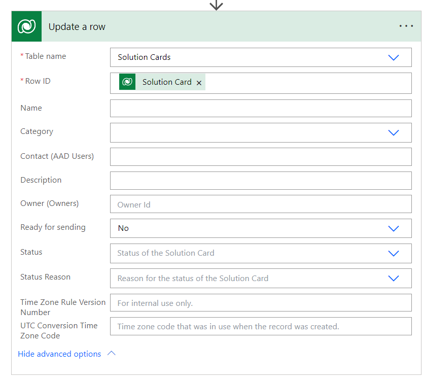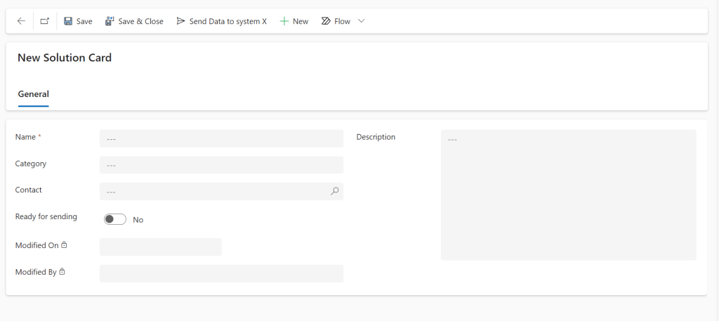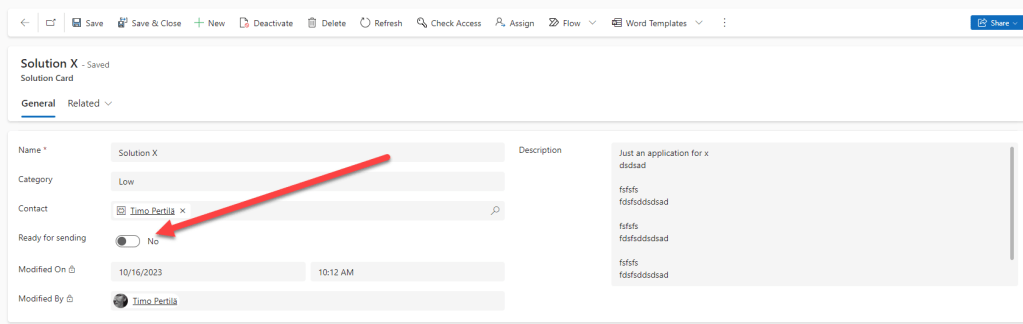 Perinteinen tapa ratkaista tämäntyyppinen ongelma on lisätä ratkaisukortille uusi kyllä/ei -tyyppinen kenttä. Kentän (Ready for Sending) arvo ilmaisee ovatko lomakkeen tiedot valmiit eteenpäin lähetettäväksi.