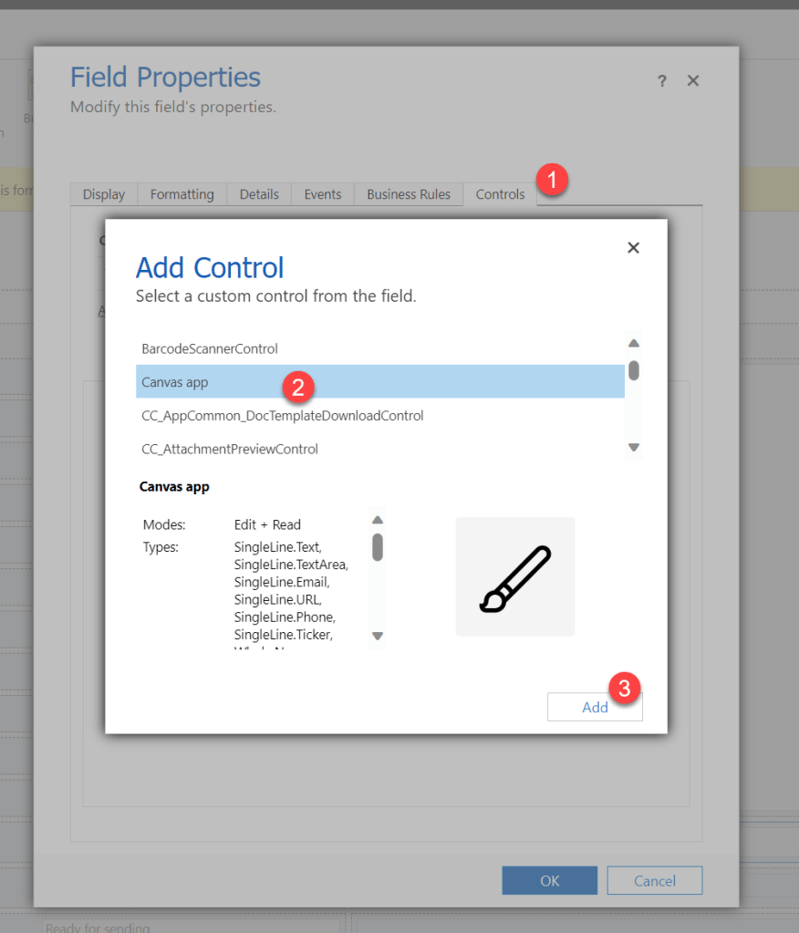 Siirrytään Controls-välilehdelle (1), lisätään kontrolli ja valitaan Canvas app (2).