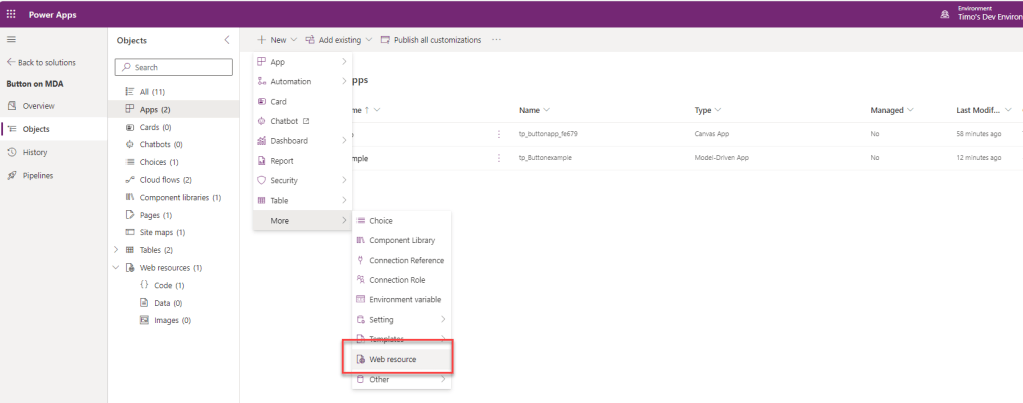 Lisätään (1) valikkoon PowerFx (2) painike.