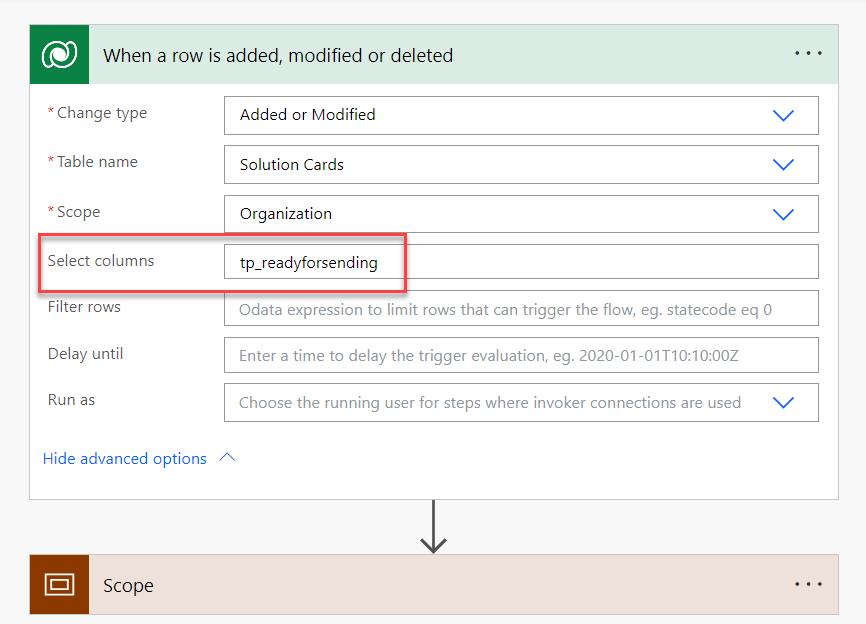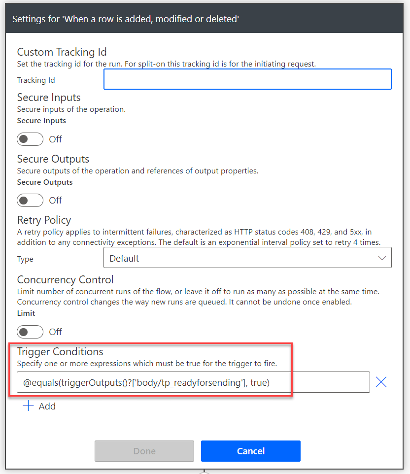 Trigger Conditions: @equals(triggerOutputs()?['body/tp_readyforsending'], true)