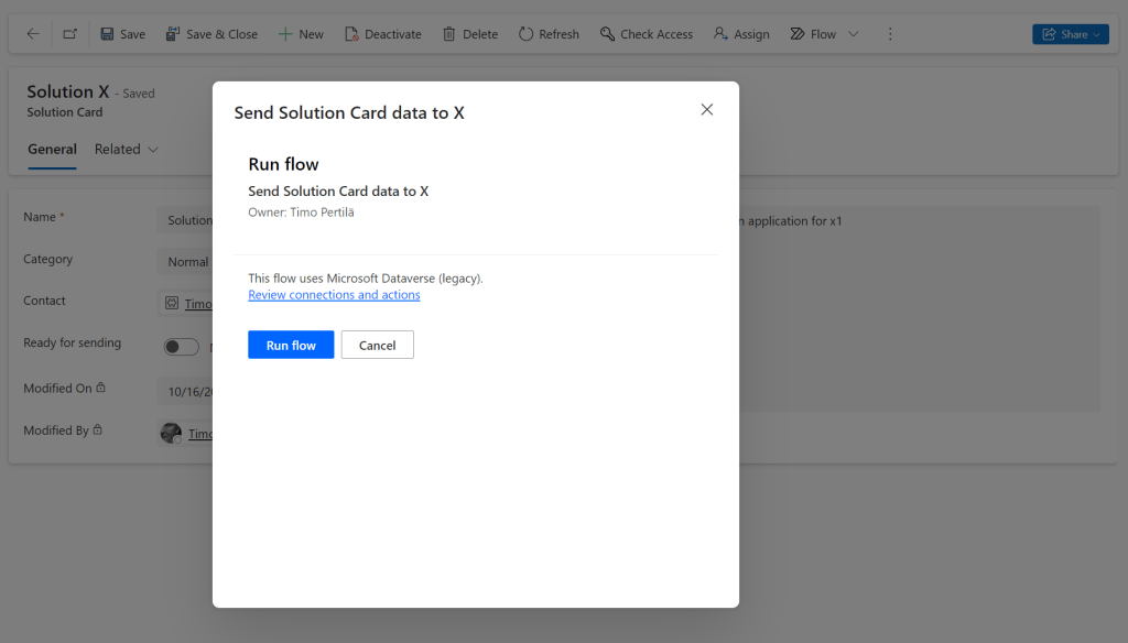 Nyt käyttäjä voi Flow-valikosta lähettää ratkaisun tiedot eteenpäin.