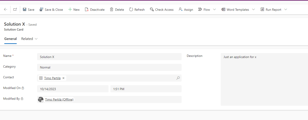 Huomaa ettei painike ole näkyvillä uutta korttia luotaessa. Lomakkeelle upotettu canvas-sovellus näkyy vasta tietoja muokatessa (jolloin se tietää mihin Dataversen riviin se liittyy).