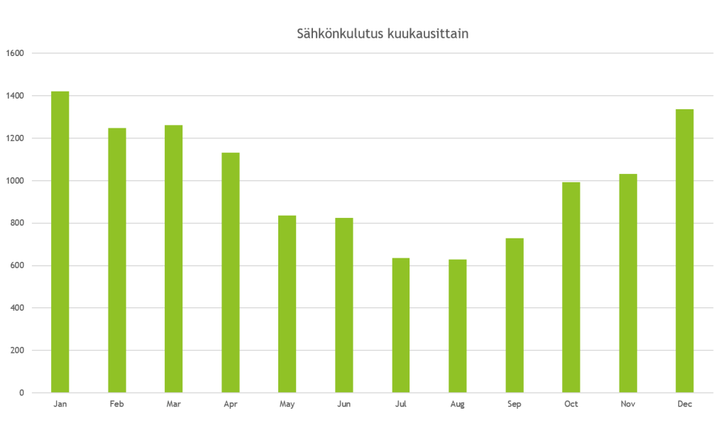Vuodessa sähköä kuluu ~12000kWh ja kuukausittainen kulutus myötäilee ulkolämpötiloja.