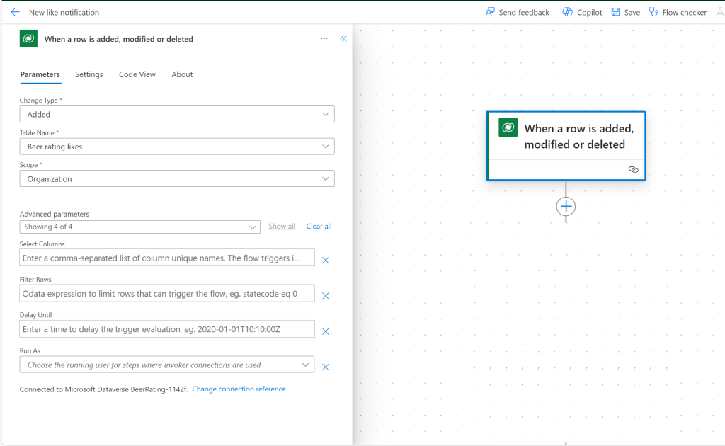 Luodaan flow, joka käynnistyy käytäjän lisätessä tykkäyksen. Eli aina kun Beer rating likes -tauluun ilmestyy uusi rivi.