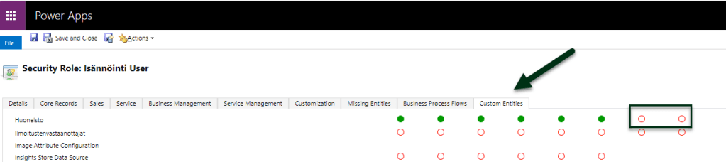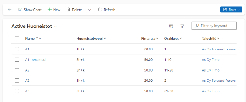 Edellä tekemämme muutokset koskevat kaikkia lomakkeita ja listoja. Voimme karsia harvemmin käytettyjä toimintoja myös taulutasolla. Määritellään, ettei käyttäjä voi jakaa (share) eikä määrätä toiselle (assign) huoneisto-tietueita.