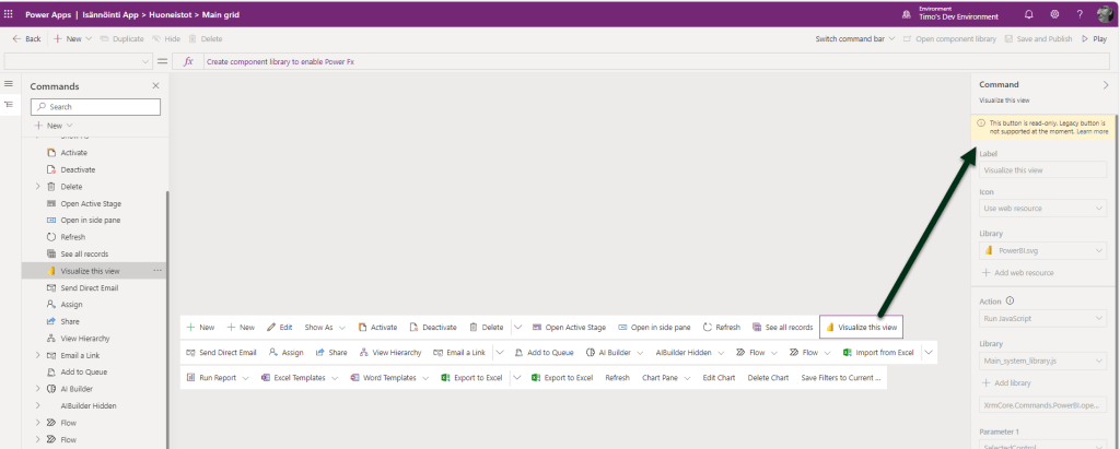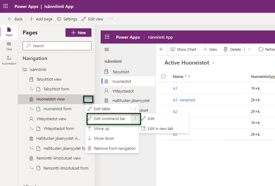 Avataan mallipohjainen sovellus muokattavaksi ja valitaan näkymän komentovalikko (Edit command bar).