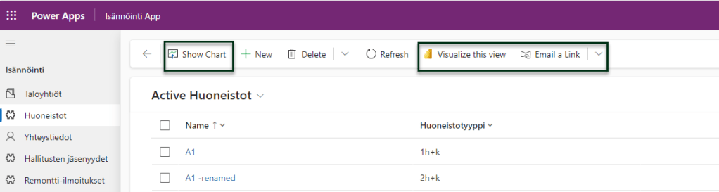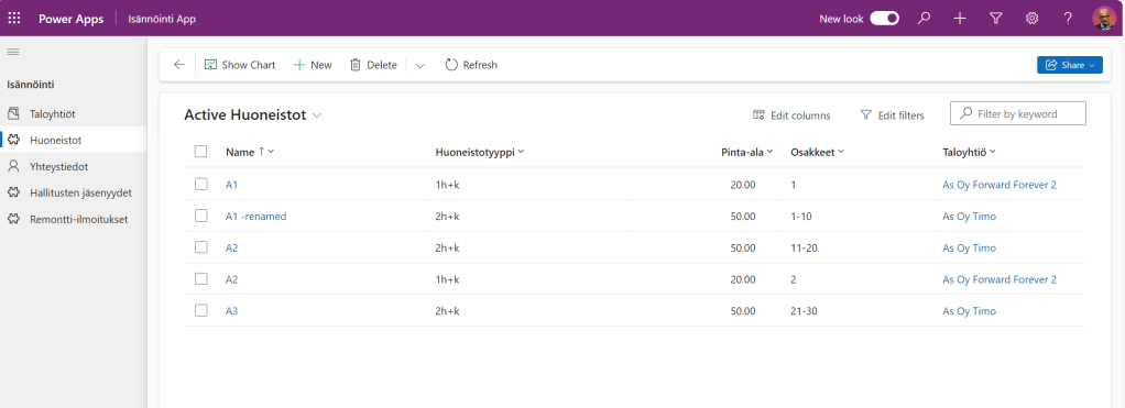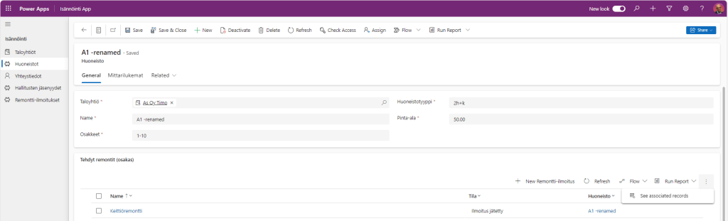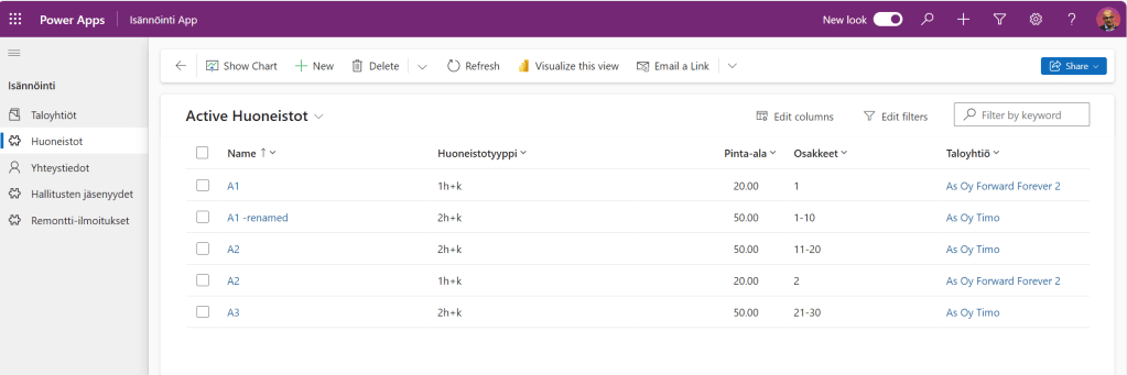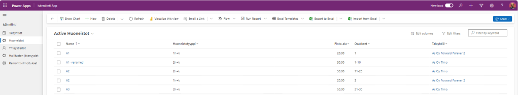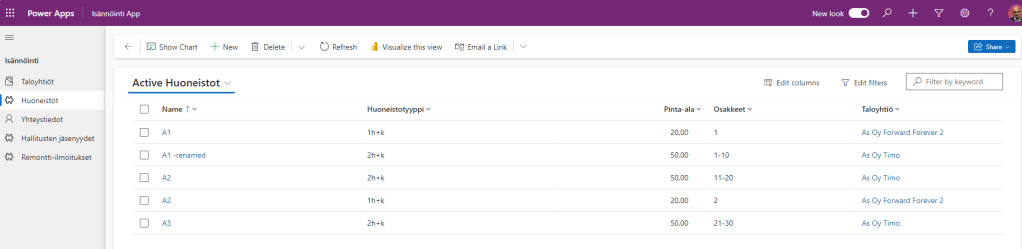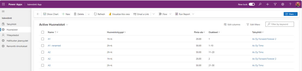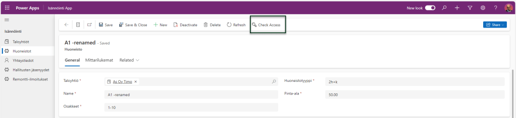 Basic User -käyttöoikeusrooli antaa kuitenkin todella laajasti oikeuksia eri toimintoihin. Aiemmin tekemämme isännöinti-sovellus näyttää Basic User -roolin (plus sovelluskohtaisen käyttöoikeusroolin) kanssa seuraavalta.