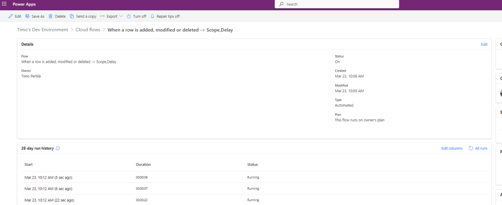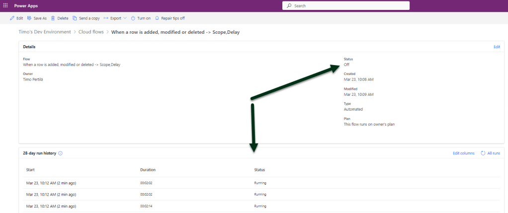 Bonuksena selvitetään mitä tapahtuu jos Dataverseen tai SharePointiin lisätään rivejä uusista riveistä käynnistyvän flow’n ollessa poissa päältä.