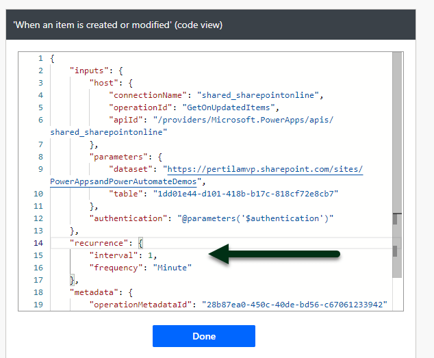 Pollaavan triggerin koodissa on määritelty miten usein trigger käy tarkistamassa mahdolliset muutokset (recurrence -> interval).