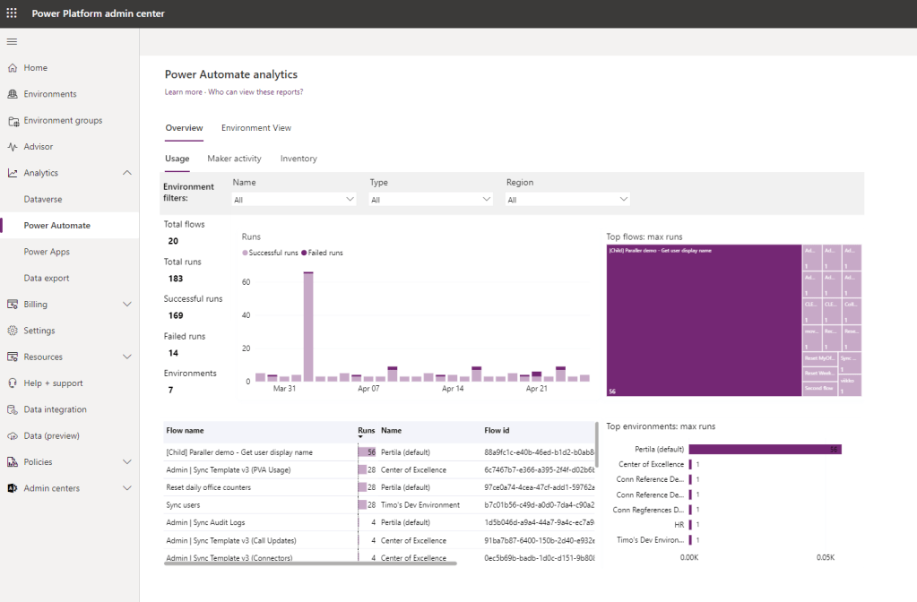 Tietoa on kyllä saatavilla. Power Platformin hallintakeskuksesta näkee esimerkiksi tiedot työnkulkujen suorituksista.
