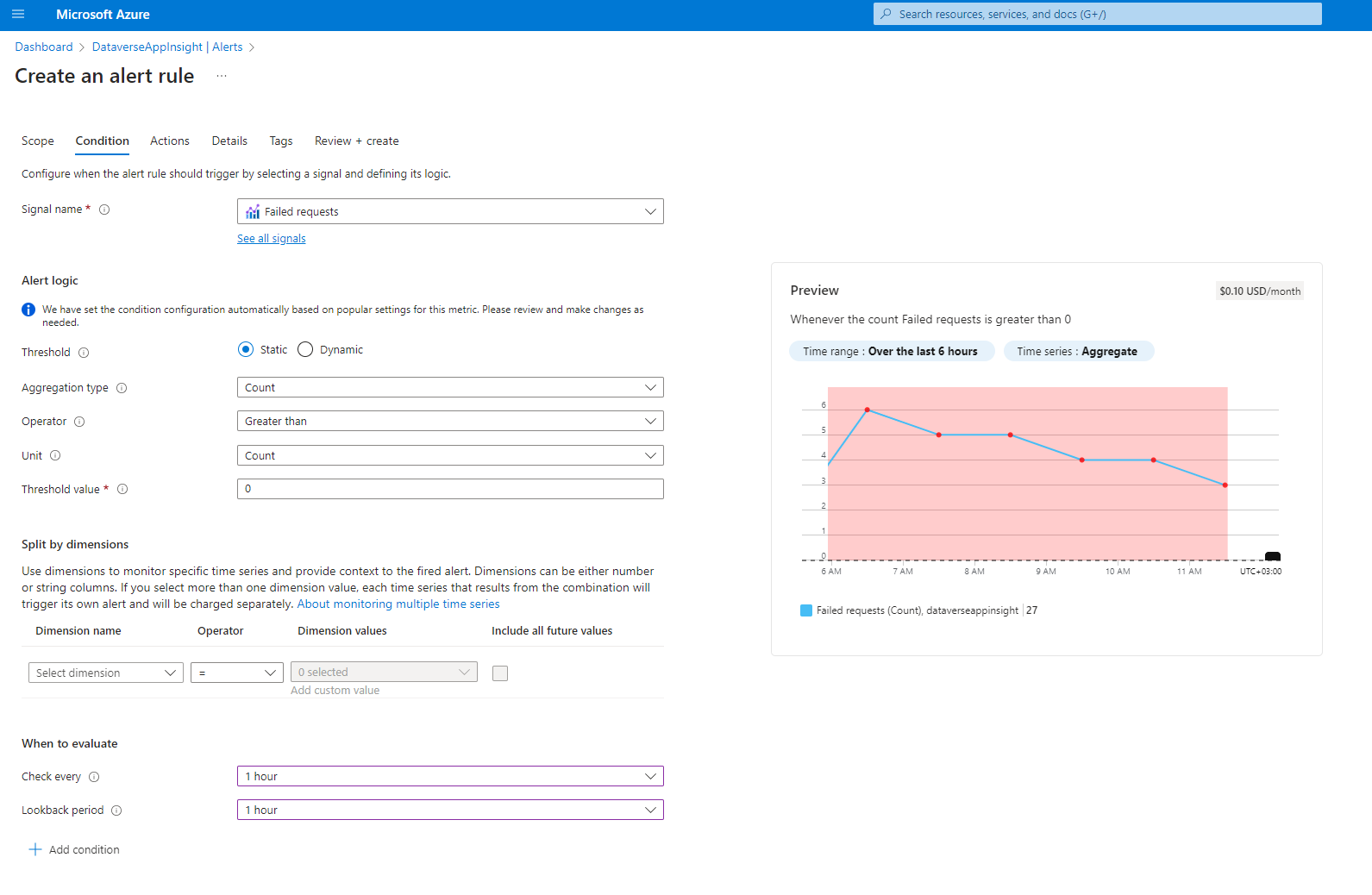 Tehdään hälytys, joka tarkkailee flow’den epäonnistumisia (failed requests). Mikäli yksikin flow on mennyt virheeseen, muodostetaan hälytys. Tilanne tarkistetaan tunnin välein (check every) ja tarkastellaan aina edeltävän tunnin suorituksia (lookback period).