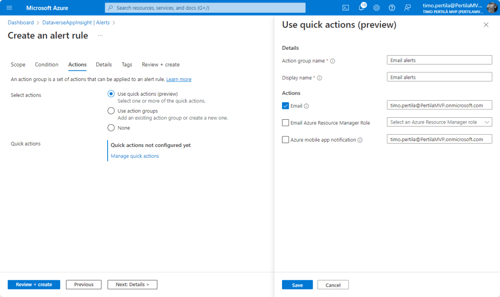 Seuraavaksi määritellään mitä hälytyksen sattuessa tehdään. Tällä kertaa lähetetään sähköpostia.