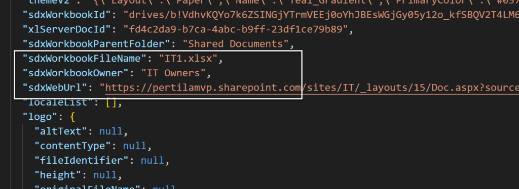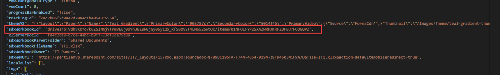 Tarvittavat drives ja items -osuudet löytyvät lomakkeen sdxWorkbookId-ominaisuudesta.