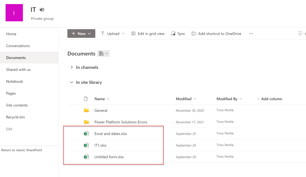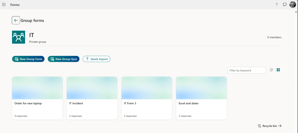 Haetaan ensin kaikki IT:n (Office 365 -ryhmä) MS Forms -lomakkeet.