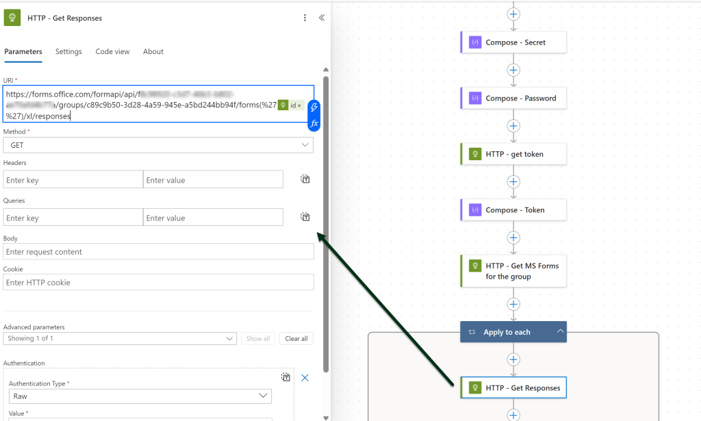 Nyt voimme hakea vastausexcelien viimeisen rivin tiedot. Haku onnistuu HTTP with Microsoft Entra ID (preauthorized) -yhdistimellä.