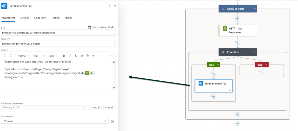 Tämä ei kuitenkaan riitä. Uudet vastaukset ilmestyvät Excel-tiedostoon vasta kun se avataan. Täydennetään ratkaisua siten, että uusista vastauksista lähetetään tieto vastuuhenkilölle, joka riemukseen saa luvan käydä avaamassa vastaavat Excel-tiedostot. Jotta raportit pysyvät ajantasalla.