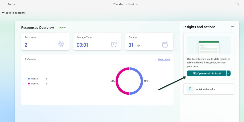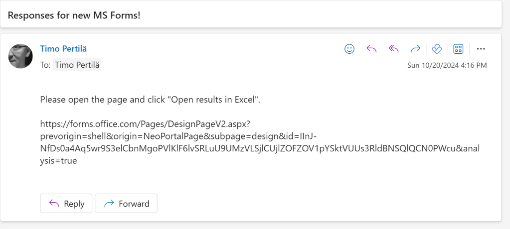 Jatkossa vastaukset sisältävä Excel-tiedosto muodostuu vasta kun se avataan MS Forms -palvelusta ensimmäisen kerran. Eikä tätä voi tehdä ennen kuin lomakkeella on lähetetty vähintään yksi vastaus.