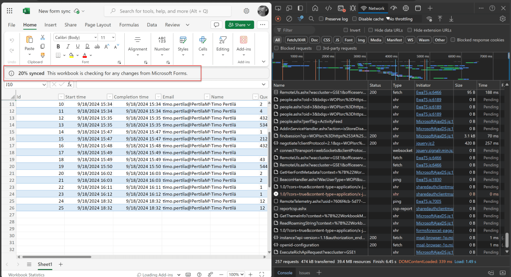 Entä jos hyödyntäisimme samaa rajapintaa, jota Microsoft käyttää päivittäessään Excel-tiedostoon MS Formsilla lähetetyt vastaukset? Avataan kokeeksi yksi tällainen tiedosto ja tutkitaan mitä vastausten synkronointi tekee.