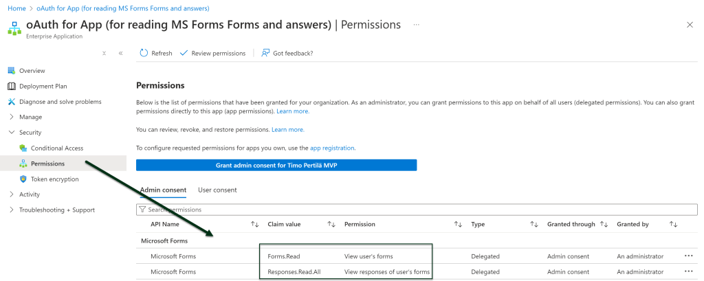 Tätä varten rekisteröidään Entra ID:hen uusi sovellus, jolla on delegoidut Forms.Read ja Responses.Read.All oikeudet Microsoft Forms -palveluun.