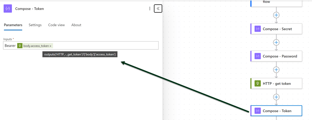 Flow’ssa tämä näyttää seuraavalta. Autentikoinnissa (alin kohta) käytetään ensimmäisen http-kutsun palauttamaa tokenia.