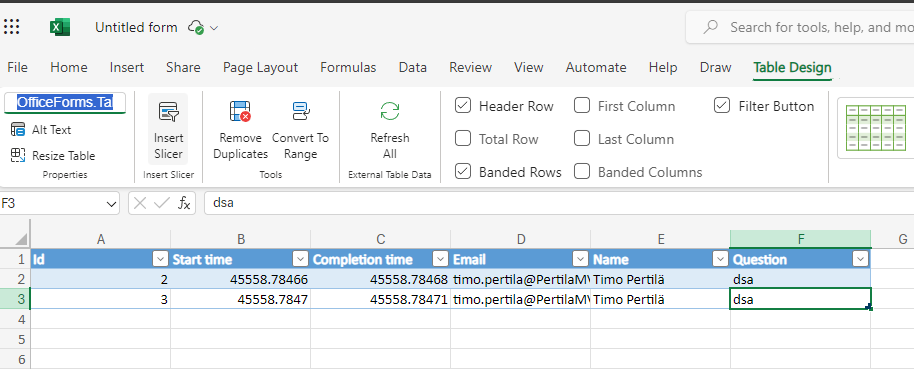 Lomakkeen vastaukset on tallennetu aina OfficeForms.Table nimiseen taulukkoon.